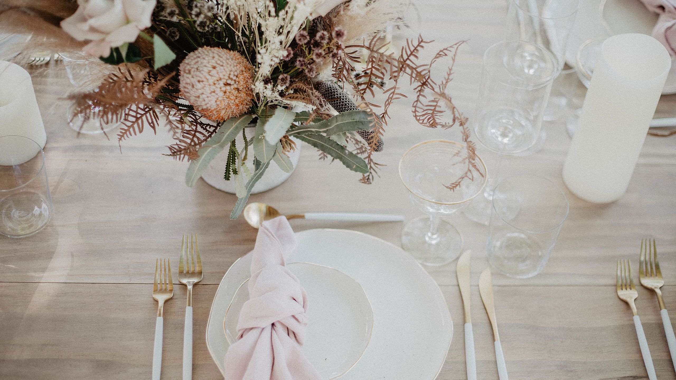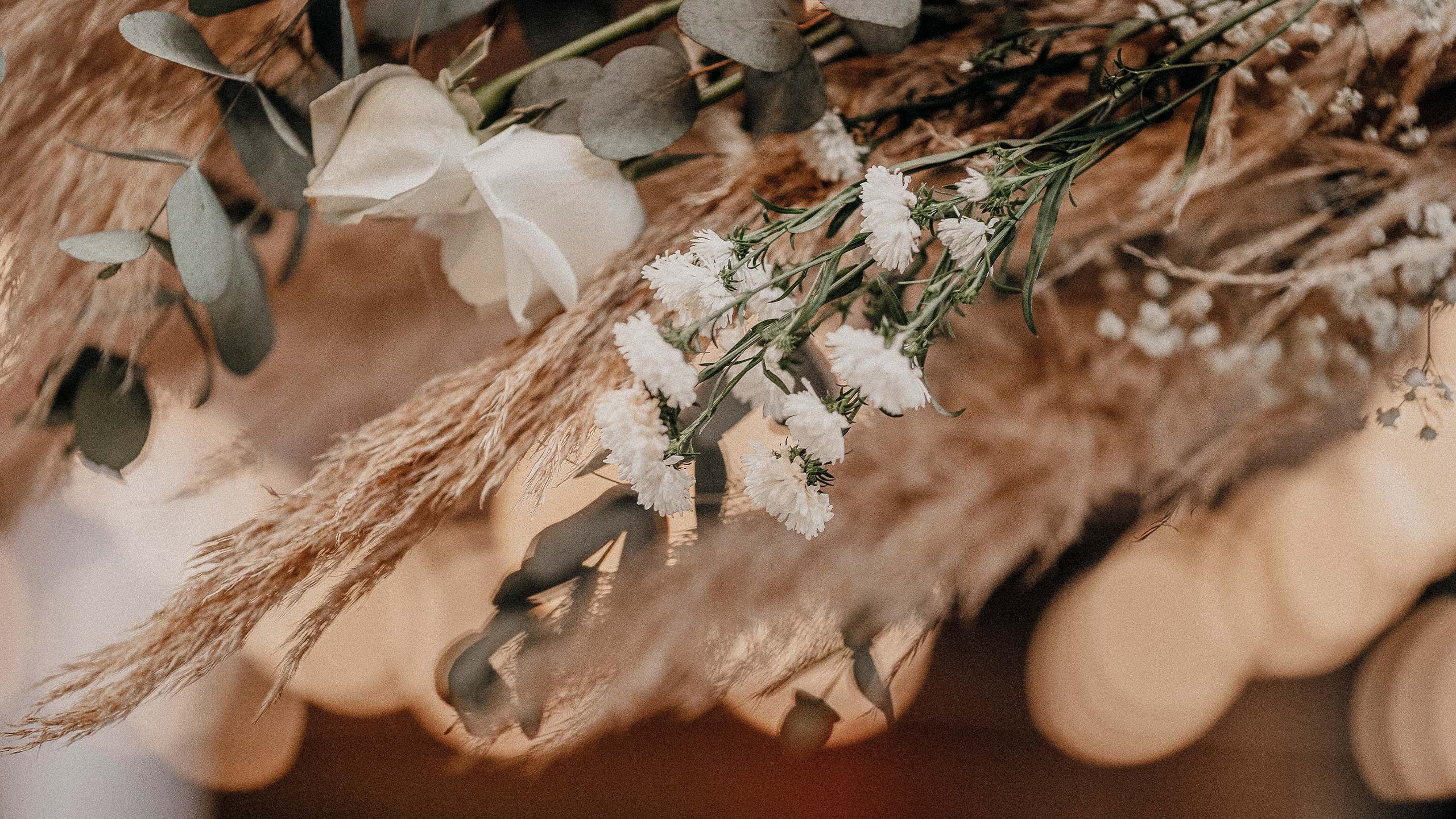 Exquisite Blüten, ausgewählte Trockenblumen, Blätter oder Zweige sind ein absoluter Hingucker als Blumenschmuck für Eure Hochzeitsdekoration.